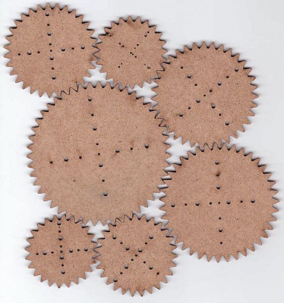 Diverse Zahnräder, aus 3mm MDF ausgeschnitten, mit Stiftlöchern Eigenes Bild